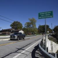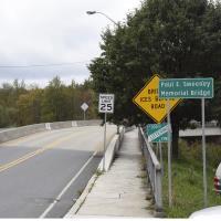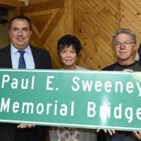 Rep. Frank Burns holds a ceremony to dedicate the Paul E. Sweeney Memorial Bridge in remembrance of the Lilly resident who received the Purple Heart for his injuries in the St. Lo campaign.