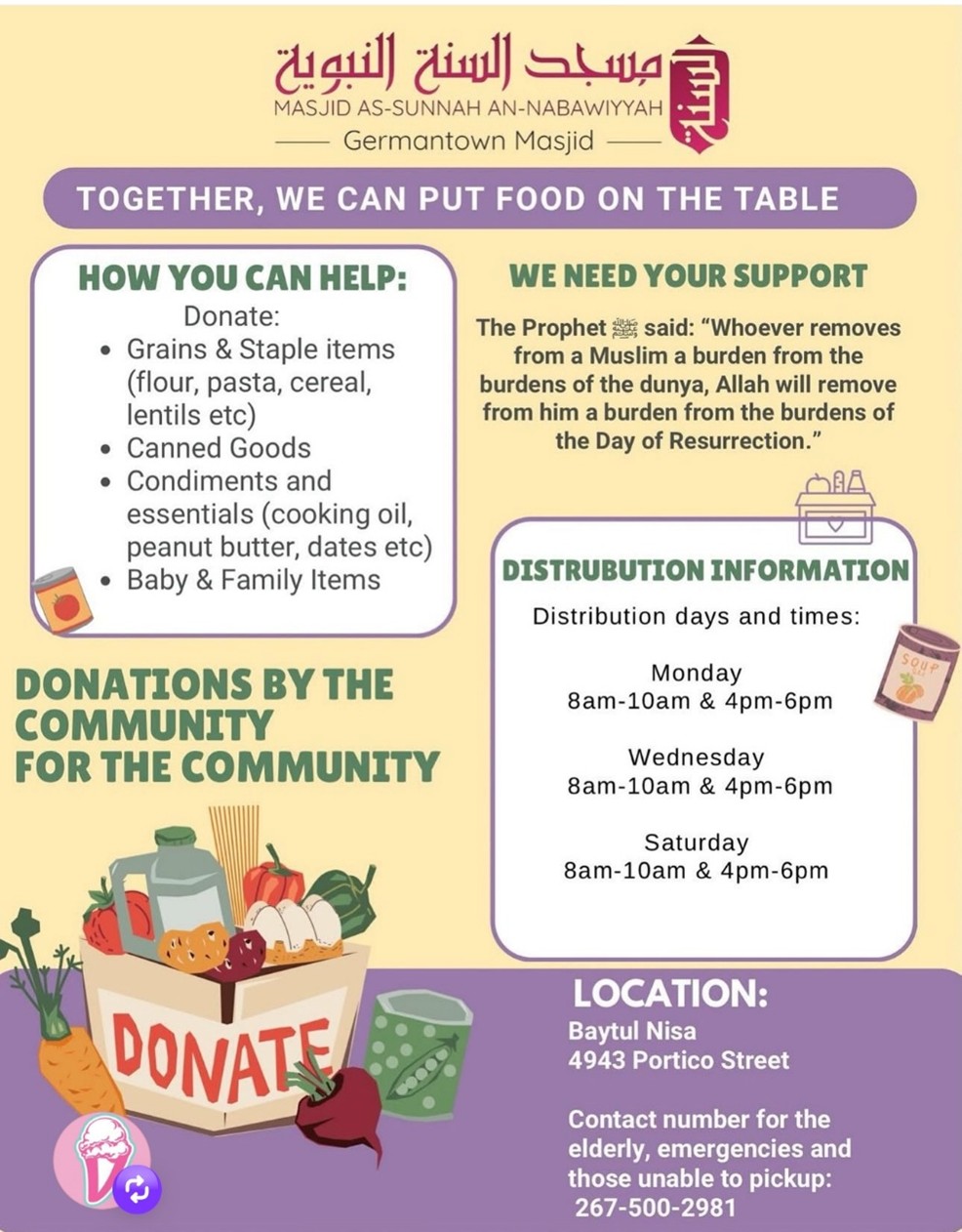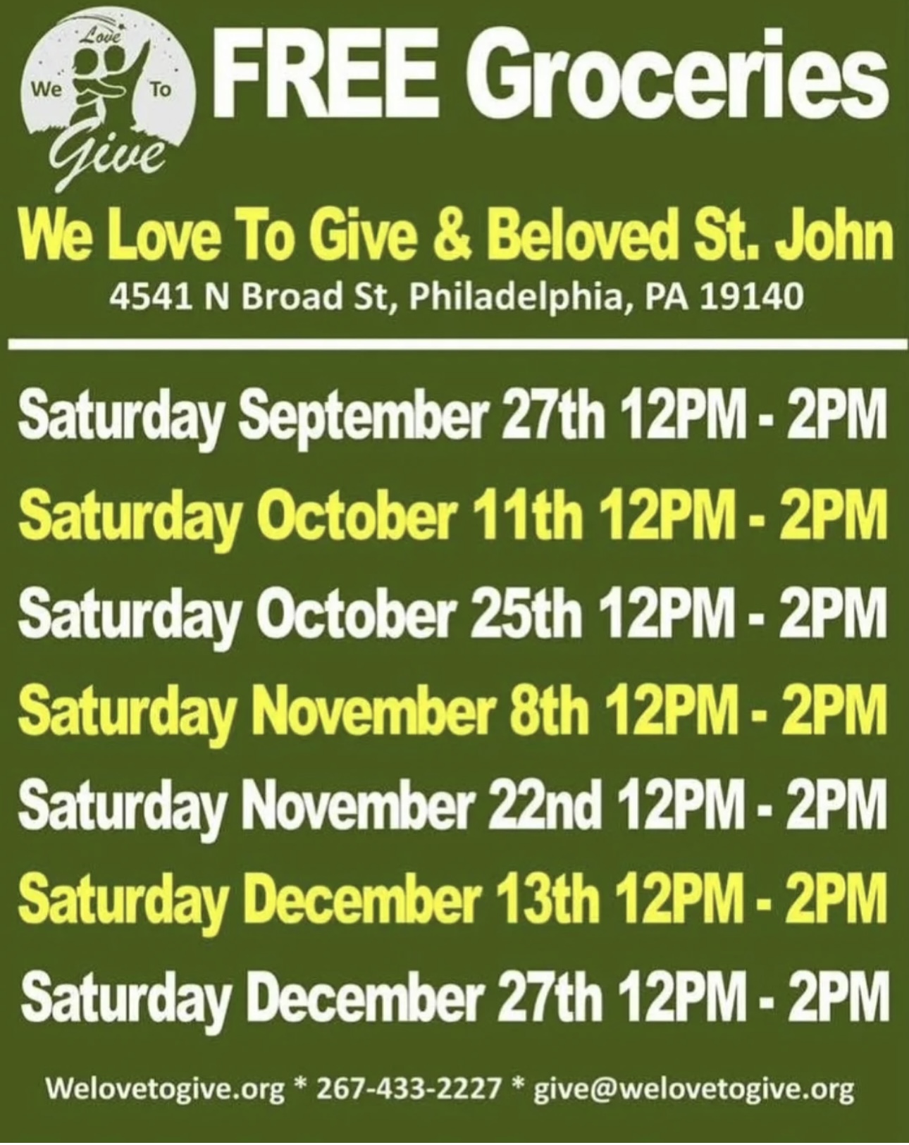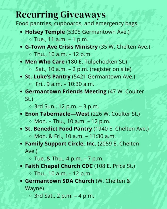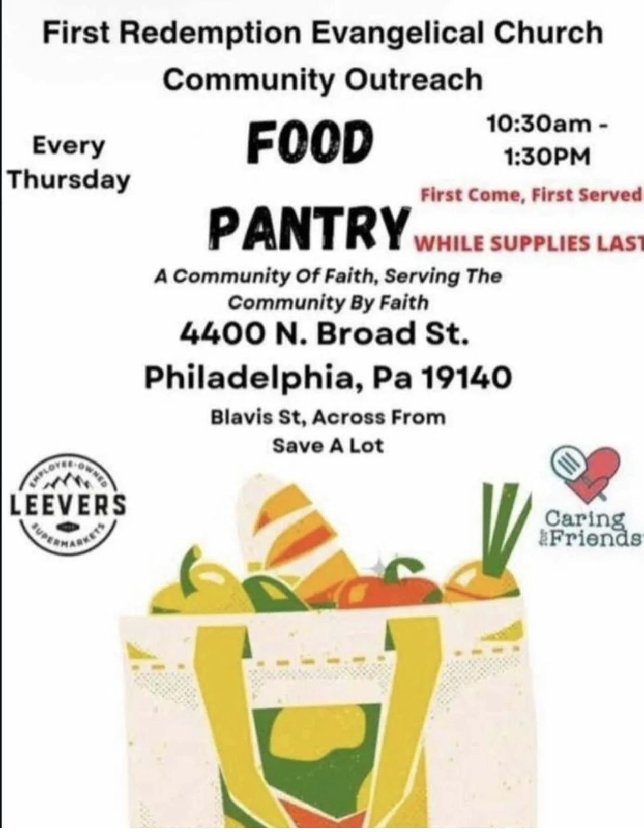 Please call ahead to confirm details before visiting. We sincerely thank these organizations for their contributions to the community. If you know of any other food banks in the district that are not listed, please call my office at (215) 849-6592 so we can add them to our list. Thank you!