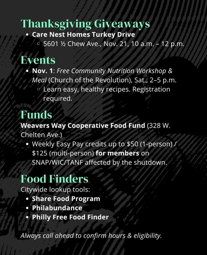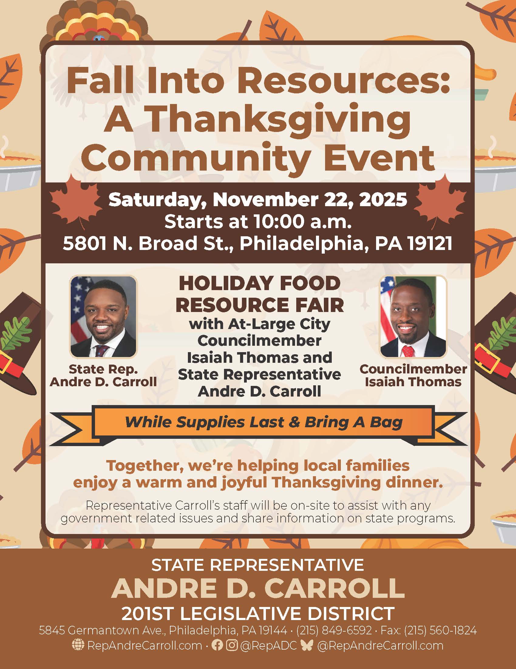 I, in collaboration with city Councilmember Isaiah Thomas, am hosting a Thanksgiving Food Resource Fair at 5801 N. Broad St., Philadelphia, PA 19121. Come out to get some food-related resources and help with any government service you may need!