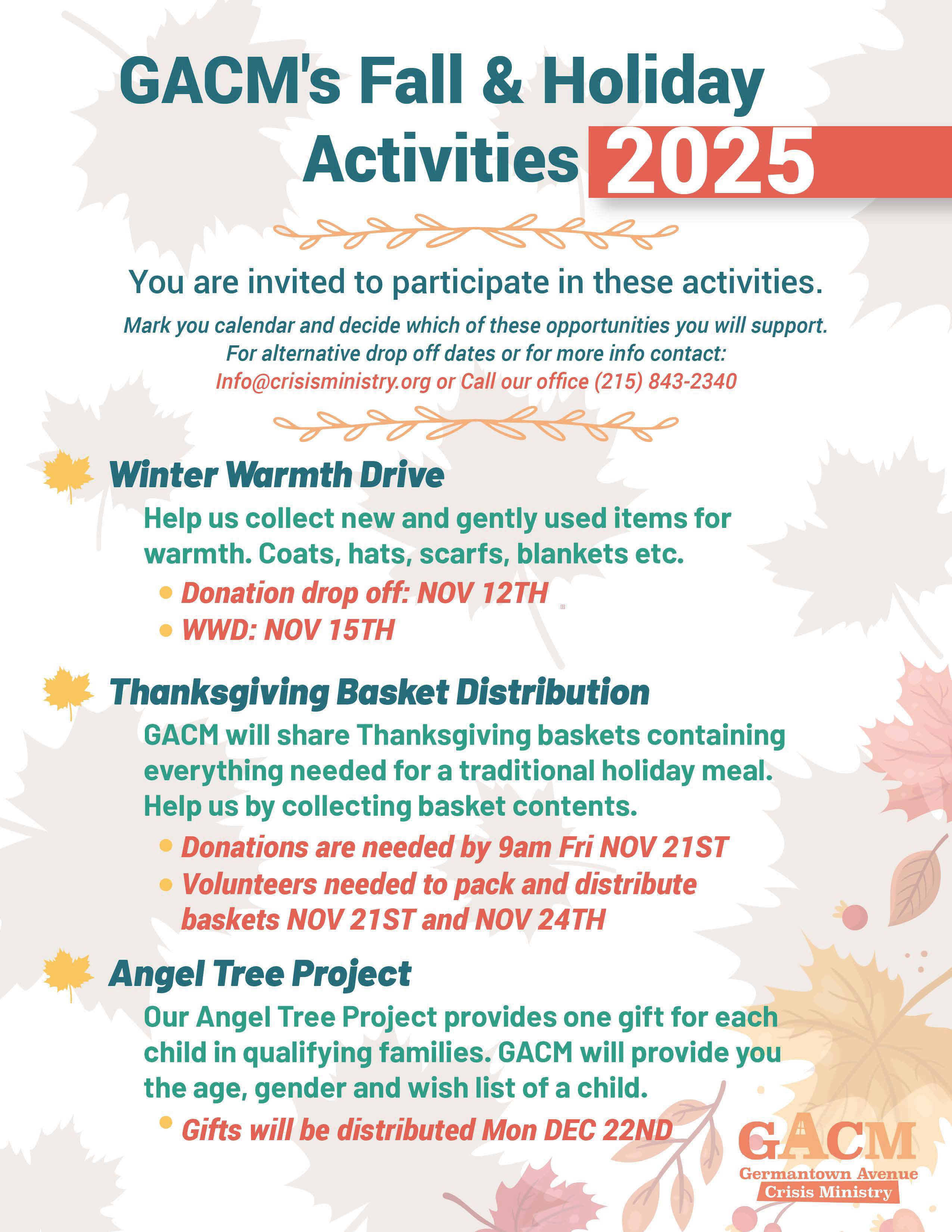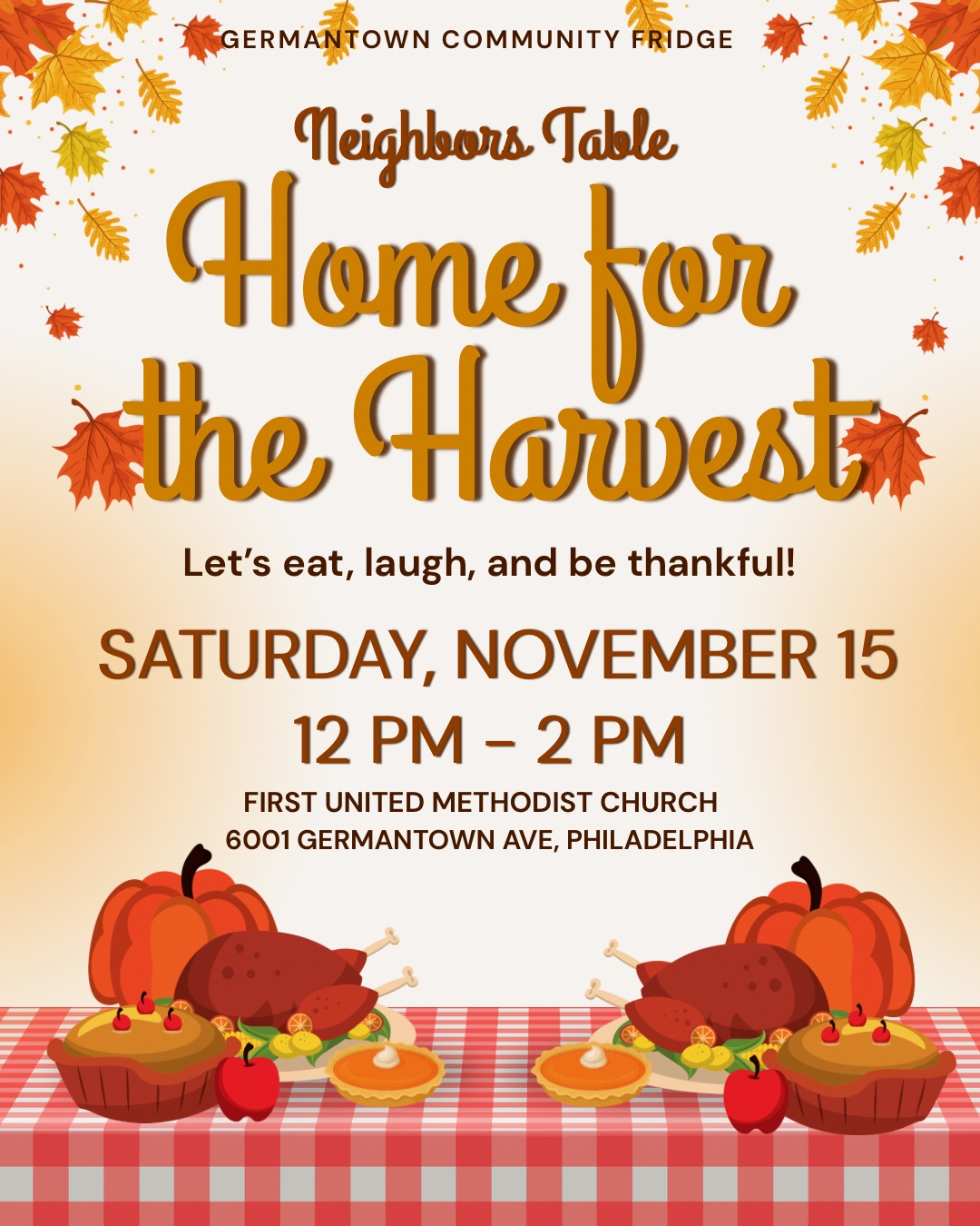 If you are in need of a hot meal, or are just want to get out and congregate with others in the community—come out to the Neighbors Table meal on November 12th from 12 p.m.- 2 p.m. Come out to the First United Methodist Church, 6001 Germantown Ave., Philadelphia. We hope to see you there!