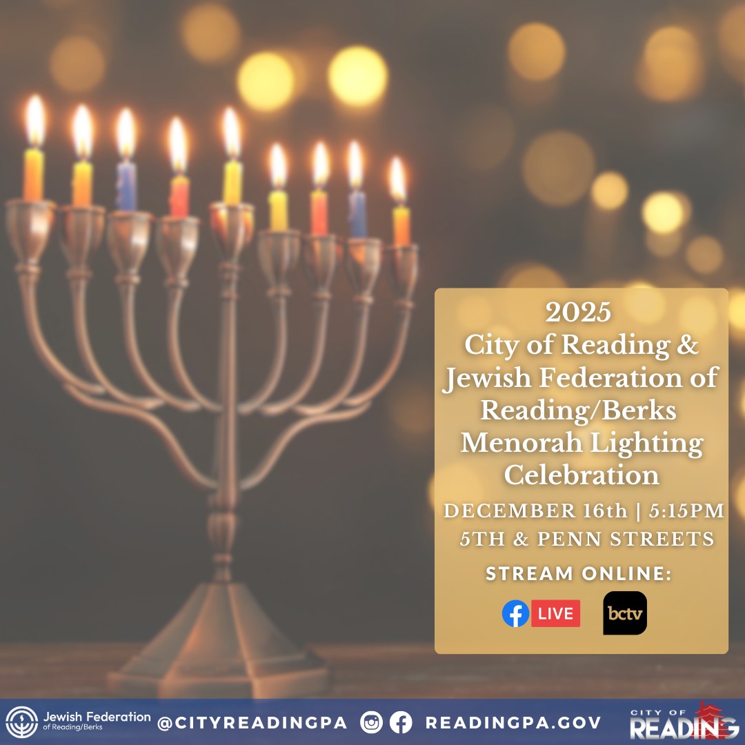 The City of Reading and the Jewish Federation of Reading/Berks will be hosting a Menorah Lighting Celebration to mark the beginning of Hannukah. The event will be on December 16 at 5:15 PM at the corner of 5th and Penn St.