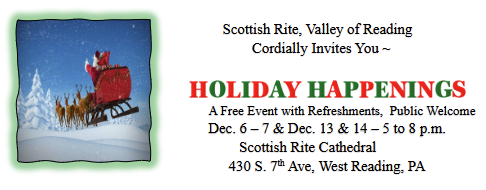 The Scottish Rite, Valley of Reading will be presenting its Holiday Happenings event at the Scottish Rite Cathedral (430 Seventh Ave., West Reading) on December 13 and 14 from 5 - 8 PM.