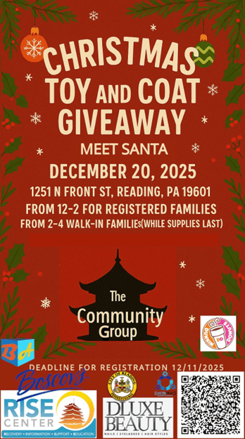 The Reading Community Group will be holding a Christmas Toy and Coat Giveaway on Dec. 20. They will have walk-in hours from 2 - 4 p.m. for families to pick out gifts, as well as the opportunity to meet Santa!