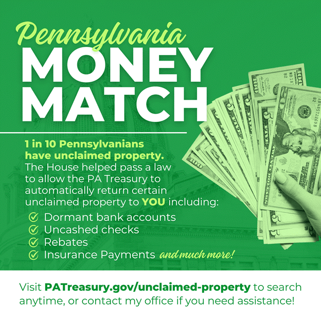 Many Pennsylvanians have unclaimed property - money from dormant bank accounts, insurance payments, uncashed checks - and you may be one of them!