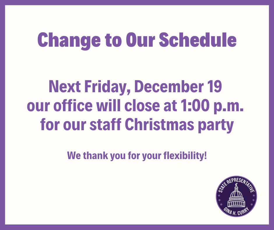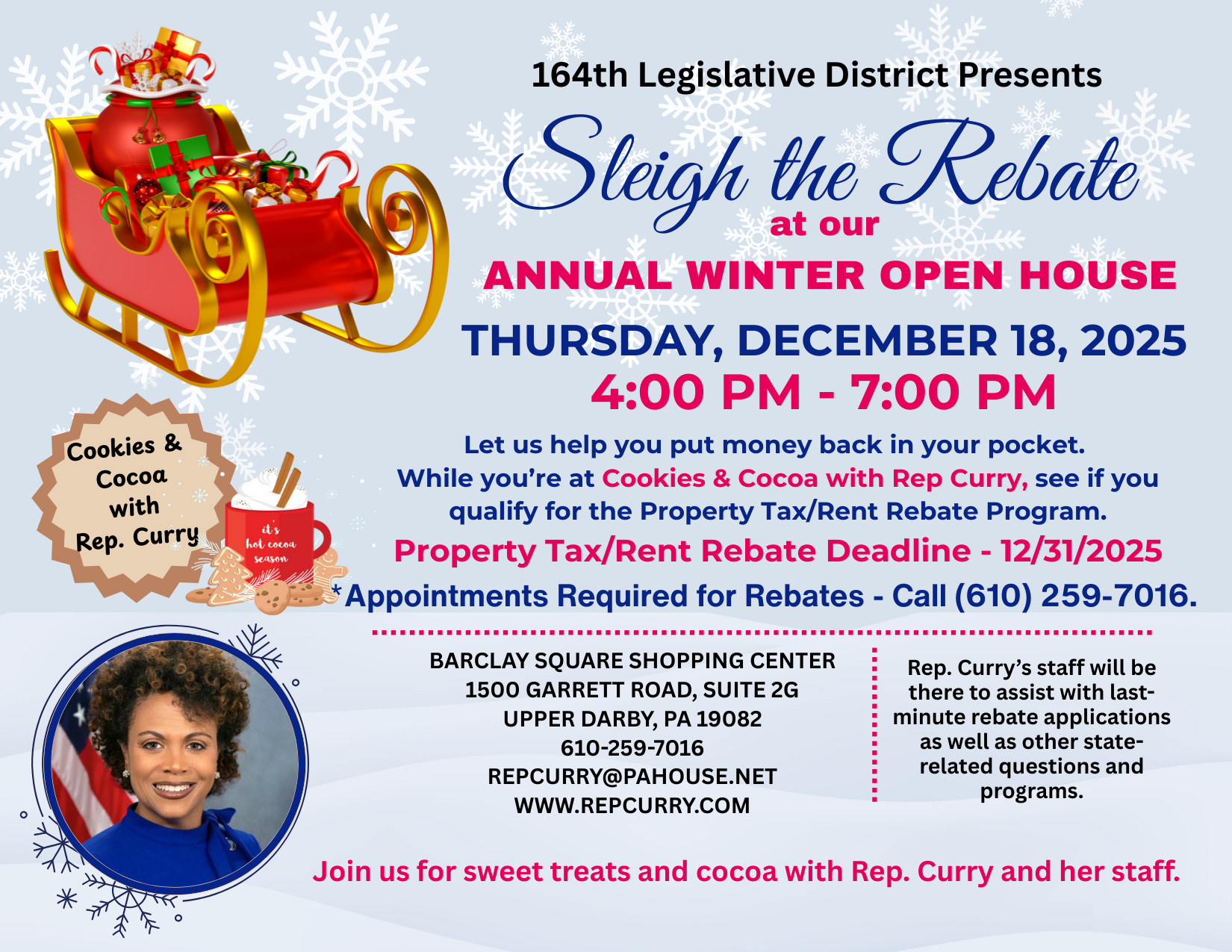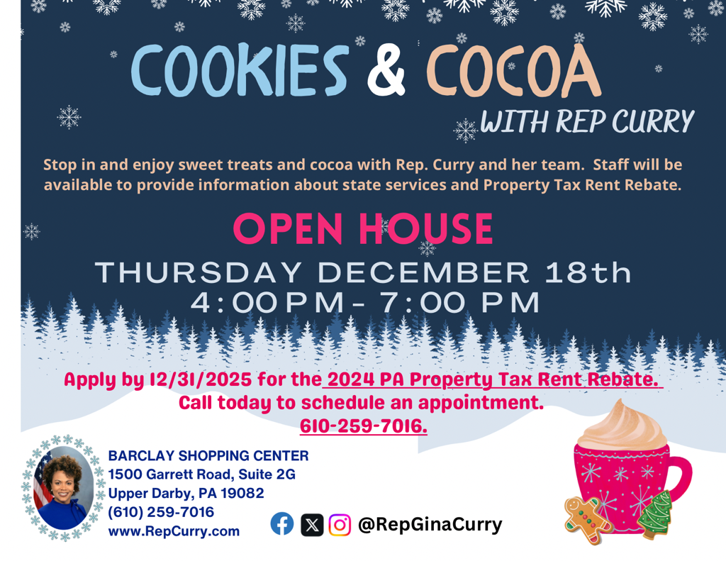 The year is drawing to a close, and I’d love nothing more than to get to know more of you as community members, neighbors, and friends. Join us at my district office on December 18 from 4 p.m. to 7 p.m. for “Cookies & Cocoa with Rep. Curry,” my annual Winter Open House. Stop by to enjoy sweet treats and cocoa, meet me and my team, and don’t forget to apply for the Property Tax/Rent Rebate Program before its December 31 deadline. I hope to see you there!