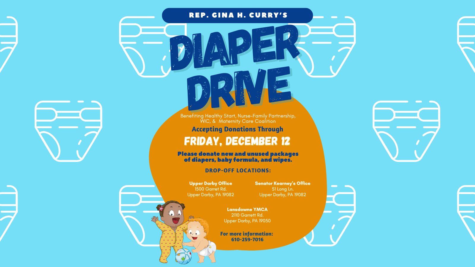 The Diaper Drive ends TODAY, Friday, Dec. 12 at close-of-business for each drop-off location. My office and Sen. Kearney’s office close at 4:30 p.m. The Lansdowne YMCA will be open until 9:00 p.m.