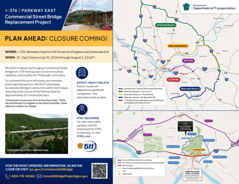 PennDOT’s reconstruction of the Commercial Street Bridge on I-376 is underway, and several local closures are already in place. Commercial Street, Forward Avenue, and the Nine Mile Run Trail are closed through February 6, 2026. The Parkway East will remain open during this period, though occasional lane restrictions will continue.