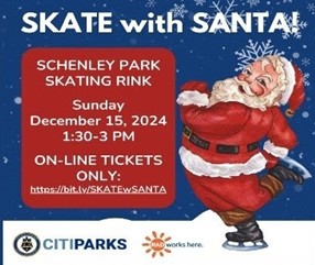The City of Pittsburgh and CitiParks will hold their annual Skate with Santa during the afternoon public skating session. Attendees may skate during regular session hours, listen to seasonal music, and take photos with Santa.