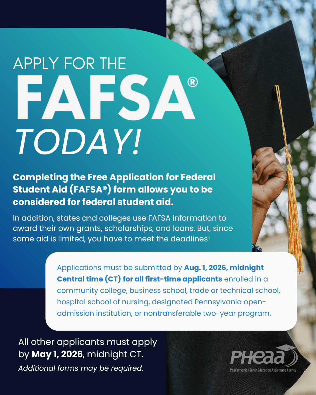 PHEAA reminds students and families to complete the Free Application for Federal Student Aid (FAFSA) form.