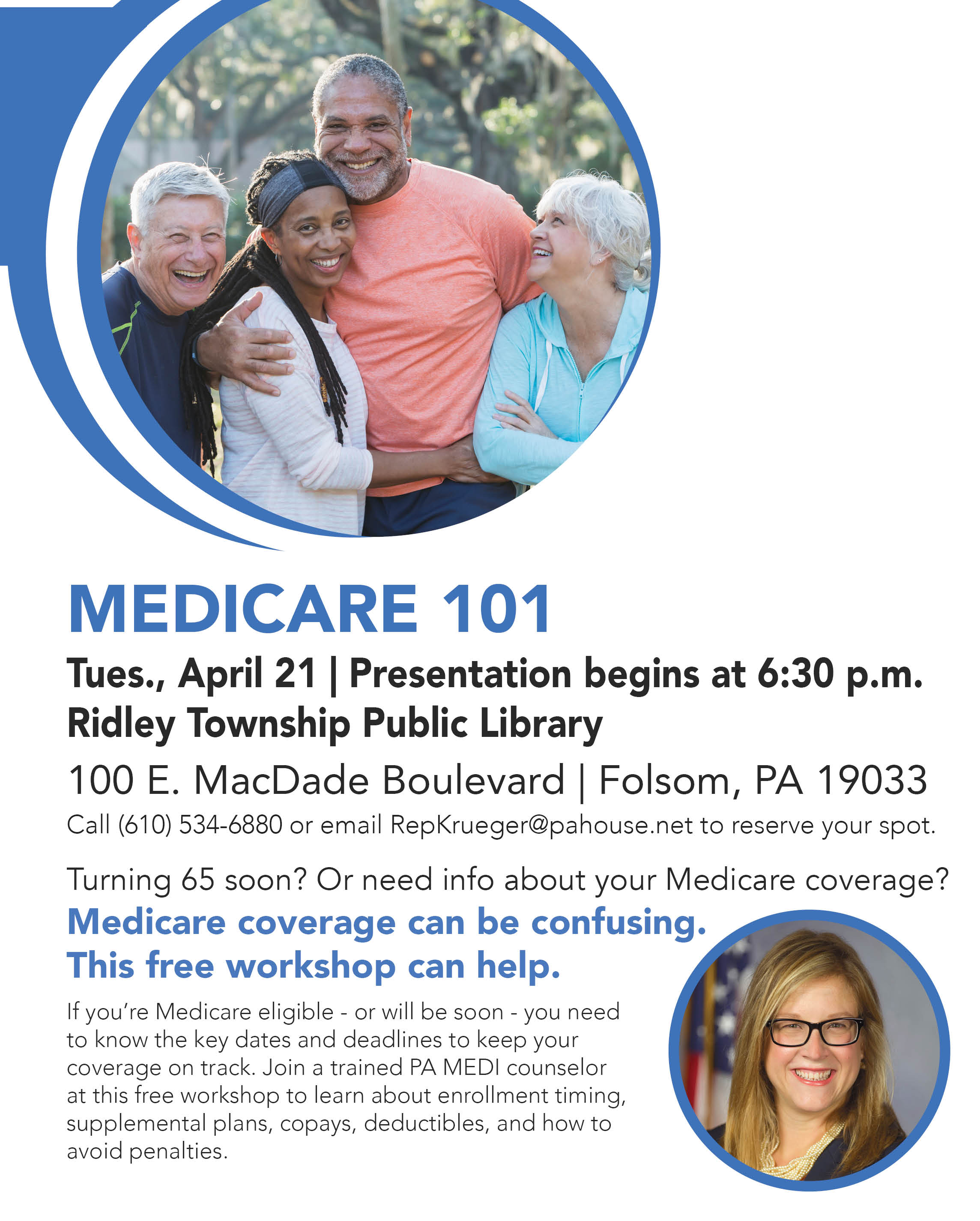 This is a FREE workshop at Ridley Township Library, where a PA MEDI counselor will help you better understand Medicare coverage, enrollment, and important deadlines.