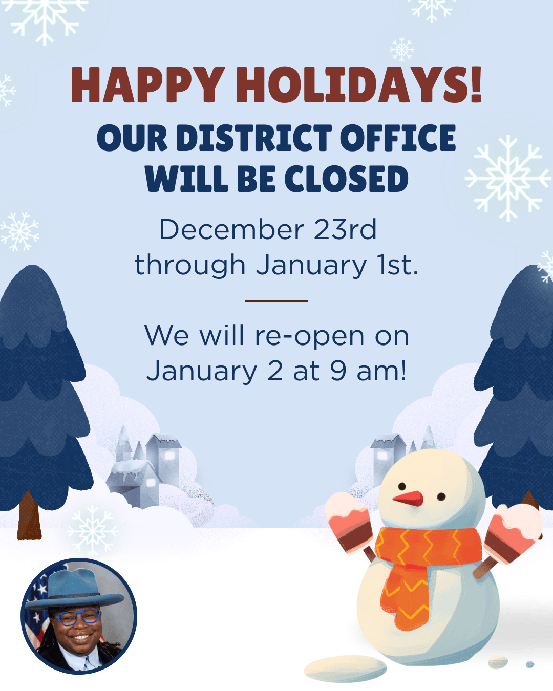 Happy New Year from me, my District Office Staff, and Harrisburg Staff! I look forward to the New Year ahead. As a reminder, our office remains closed through Thursday, January 1, 2026, and we will re-open on Friday, January 2 at 9 a.m. You can leave a voicemail at 412.665.5502 or email RepMayes@pahouse.net, and my staff will respond as soon as we return.