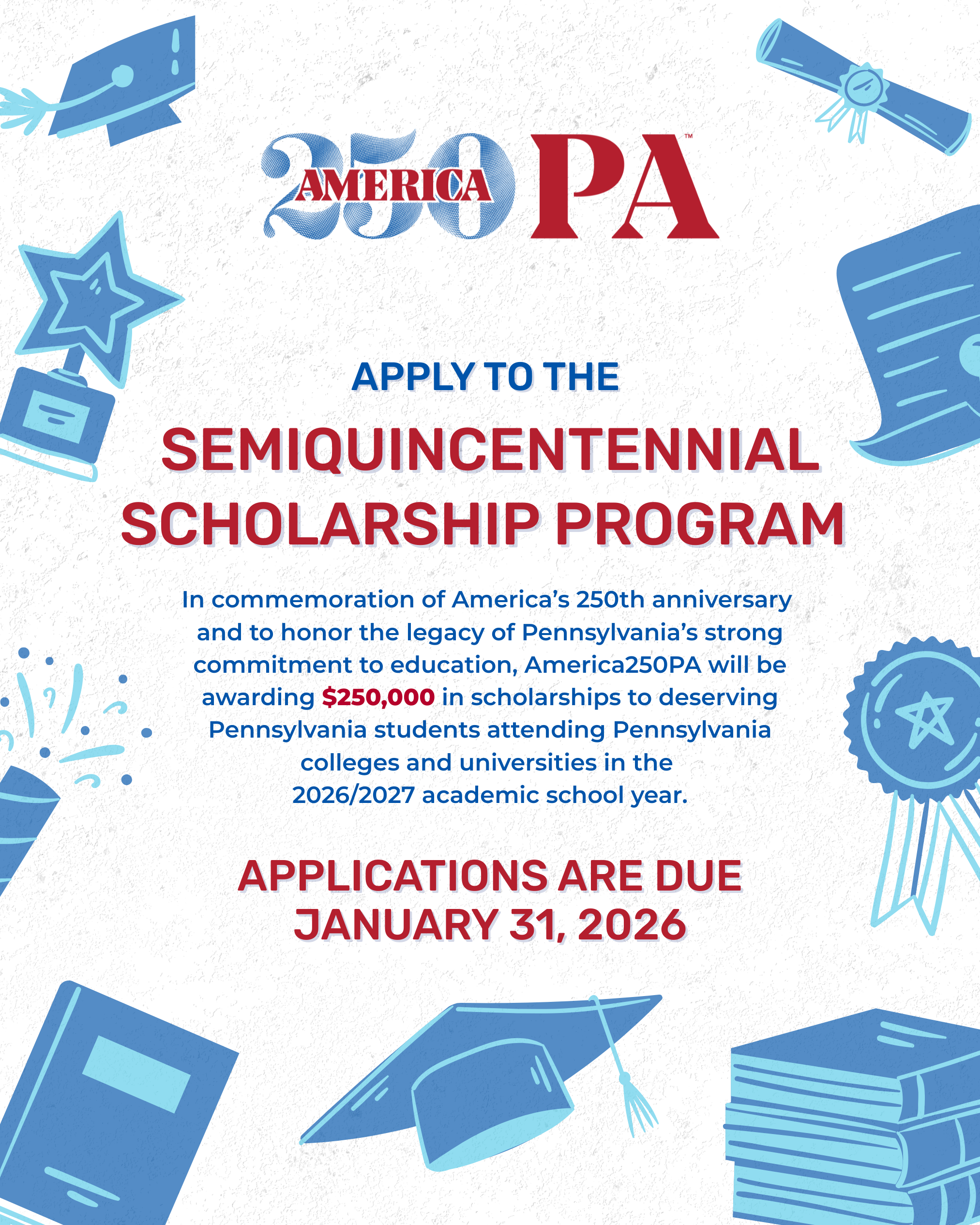 America250PA is celebrating Pennsylvania's commitment to education by awarding $250,000 in scholarships to Pennsylvania college students. Applications are due on January 31 - don't miss out on this opportunity to be a part of Pennsylvania's legacy!