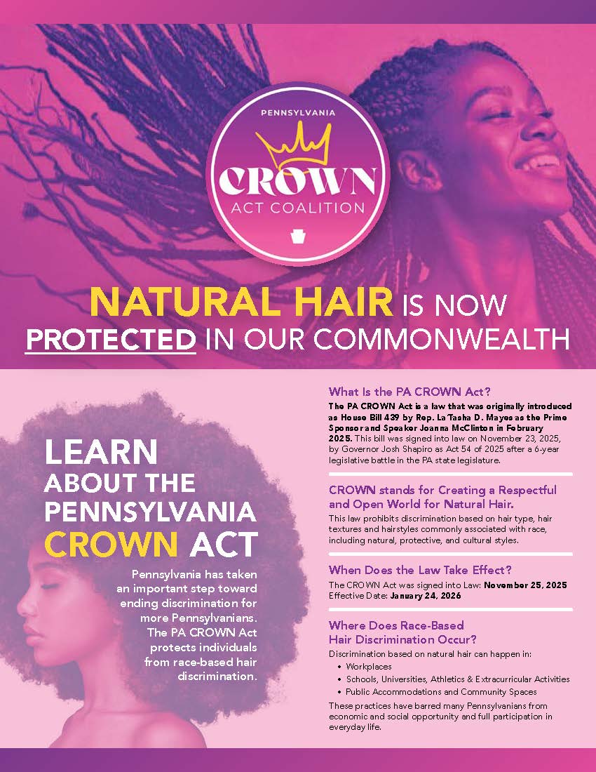 The PA CROWN Act was originally introduced as House Bill 429 by Rep. La’Tasha D. Mayes, with Speaker Joanna McClinton as a co-sponsor, in February 2025. The bill was signed into law on November 23, 2025, and becomes effective tomorrow, January 24, 2026!