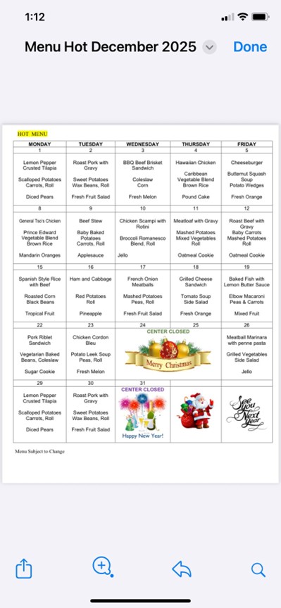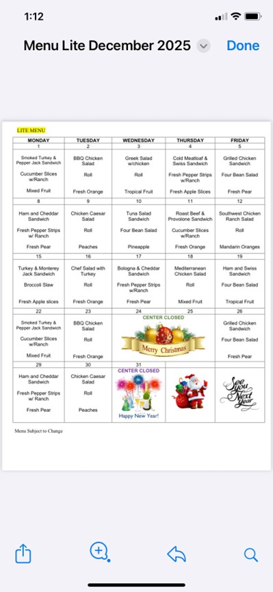 Hope everyone had an enjoyable Thanksgiving with friends and family. Above find the menu for December. Keep checking for dates and activities since there is so much difference this month.
