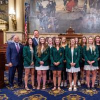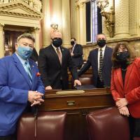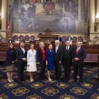 State Rep. Bob Merski, D-Erie, welcomes guests to the state Capitol June 17 as the House unanimously adopted Merski's H.R. 353, commemorating 100 years of diplomatic relations between the United States and Poland and the commonwealth's strong Polish-American community. The guests included Kamil Henne, Deputy Consul General of the Republic of Poland in New York; Deborah Majka, Honorary Consul of Southeastern Pennsylvania; Peter Obst, representative of the Poles in America Foundation; and Sylwia Czajkowska, Hanna Wewiora, and Michael Wewiora, secretary, treasurer, and member, respectively, of the Kosciuszko Foundation Philadelphia Chapter.