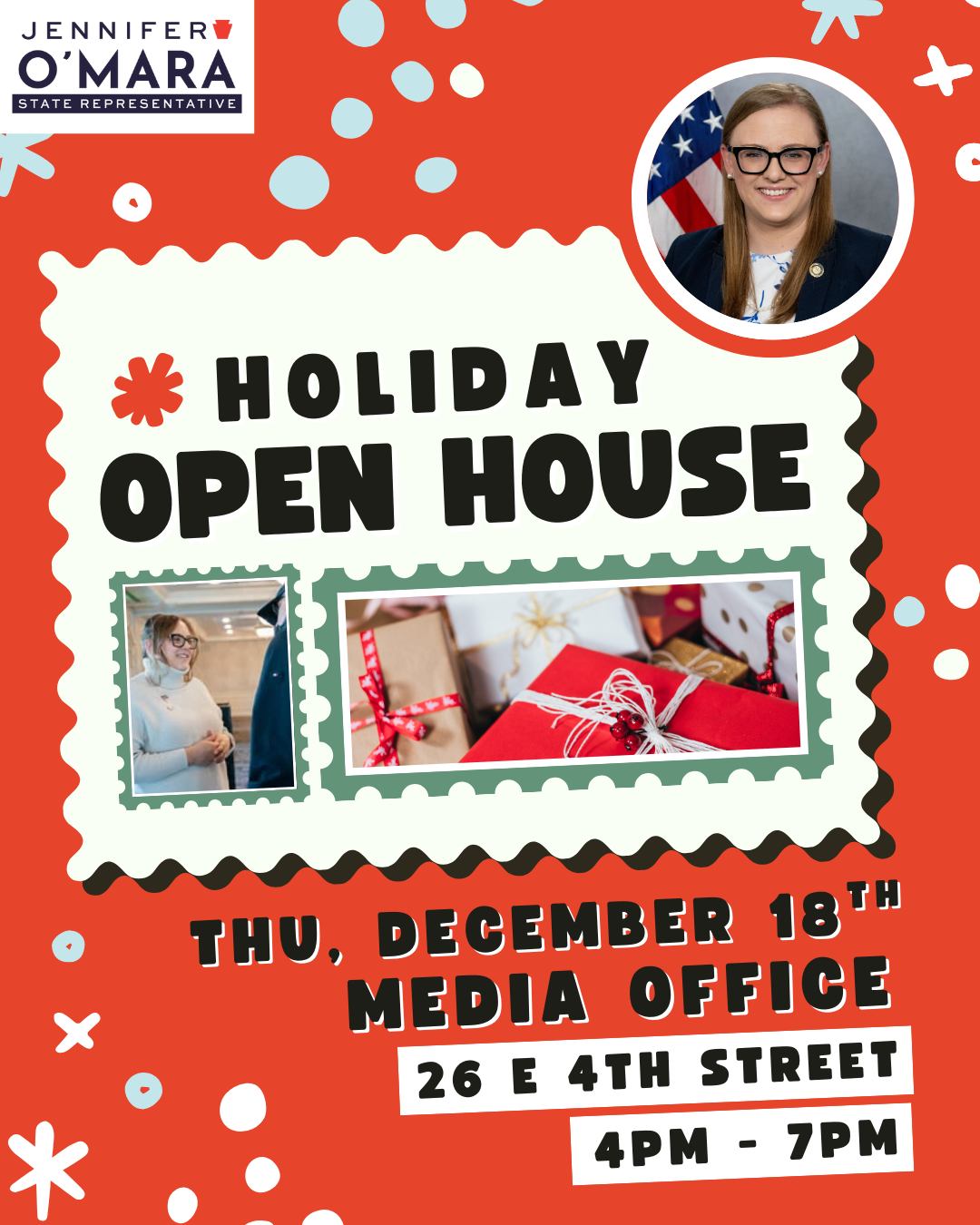 I hope you can join me for my Holiday Open House from 4 to 7 p.m. on Thursday, December 18 at my Media office. My staff and I will be on hand to listen to your thoughts on legislative issues and provide information about state programs and services. We’ll have light refreshments, and we’ll be happy to extend our warmest wishes to you and your loved ones this holiday season.