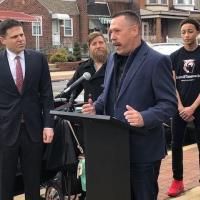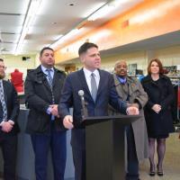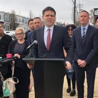 Rep. Jared Solomon announced a grant for the Wissinoming Civic Association to fund several solar trash compactors on Torresdale Avenue during a news conference Feb. 26.