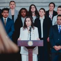 Rep. Emily Kinkead co-hosts a press conference to discuss legislation dealing with universal school meals.