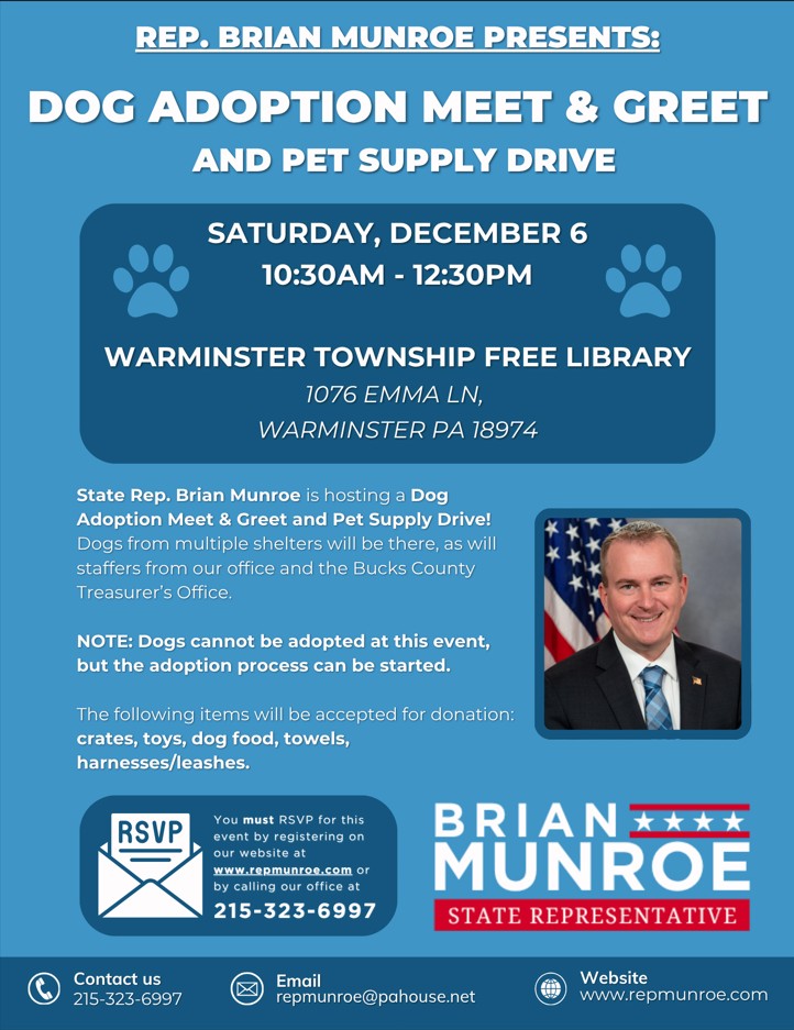During the event you’ll have the chance to talk with staff from several area shelters, ask questions about adopting pets, meet a few of the dogs available for adoption, and even start the adoption application process. My staff and I will also be on hand, along with staffers from the Bucks County Treasurer’s Office, to share how we can help support you with pet ownership and more.