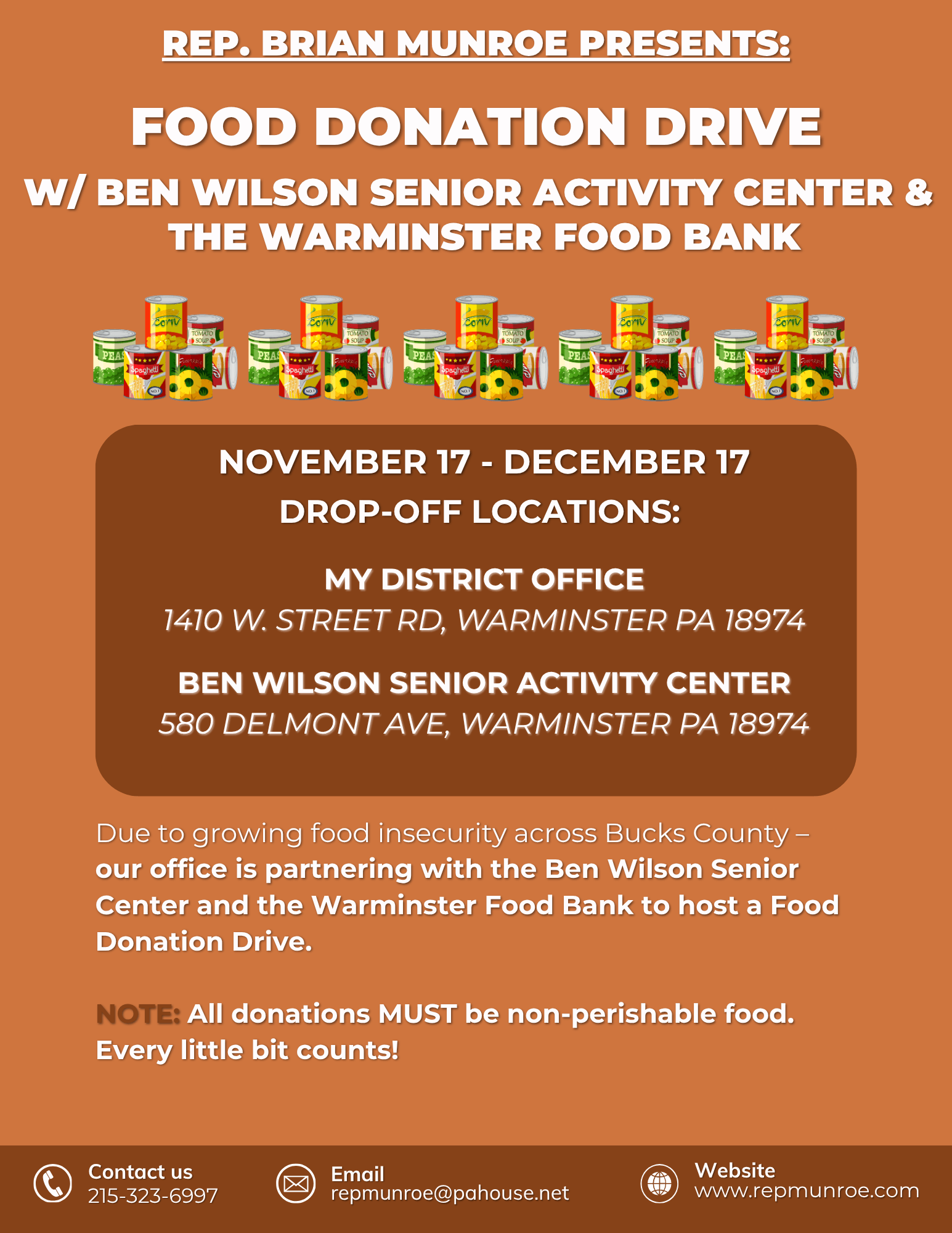 There’s still time to donate to our Food Donation Drive! Drop off non-perishable food items at my district office or at the Ben Wilson Senior Center through Wednesday, Dec. 17 to help the Warminster Food Bank feed families in our community.