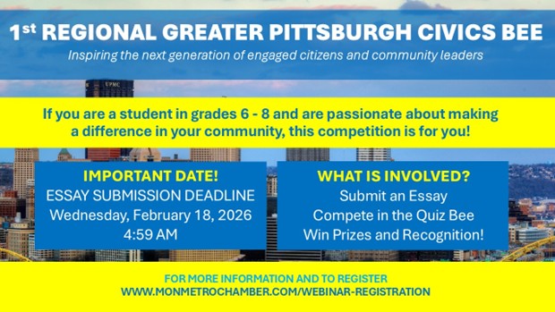 Calling all 6th, 7th, and 8th graders! Share your ideas about how to make a difference in your community by entering the 1st Regional Greater Pittsburgh Civics Bee!