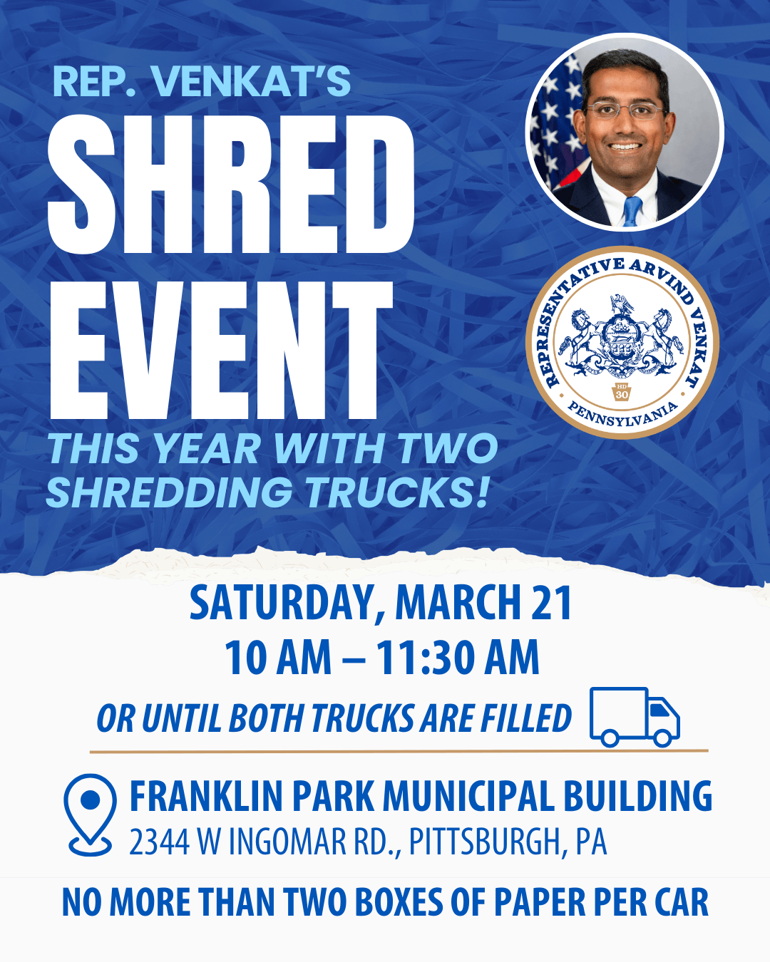 Protect yourself from identity theft by joining us for our free shred event on Saturday, March 21. Due to high demand last year, we will have two trucks at this event! Stop by the Franklin Park Municipal Building at 2344 W. Ingomar Rd. from 10:00 a.m. to 11:30 a.m. (or until the trucks are full).