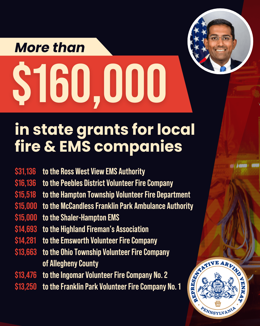 As an emergency physician, I’ve witnessed firsthand the lifesaving work our first responders perform every day—often at great personal risk. That’s why I’m proud to announce that more than $160,000 in grant funding has been approved for local fire and EMS companies in our district to support their critical mission and strengthen emergency services in our community.
