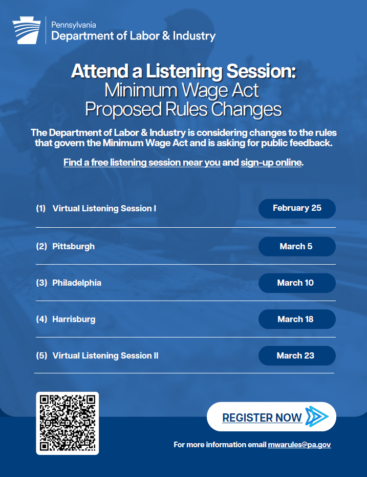 The Department of Labor & Industry will be hosting sessions to consider changes to the rules that govern the Minimum Wage Act, including one in Pittsburgh on March 5.