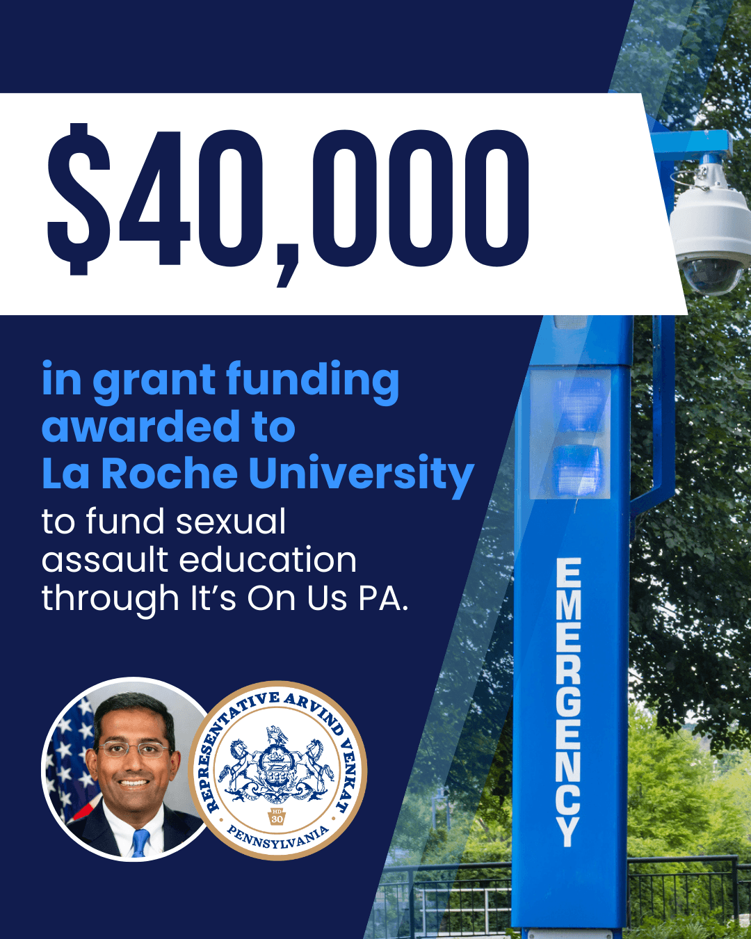La Roche University will also receive $40,000 to fund sexual assault education through It’s On Us PA. We must ensure that all students are able to learn and live in a safe environment, and this state funding will help the community at La Roche do so.