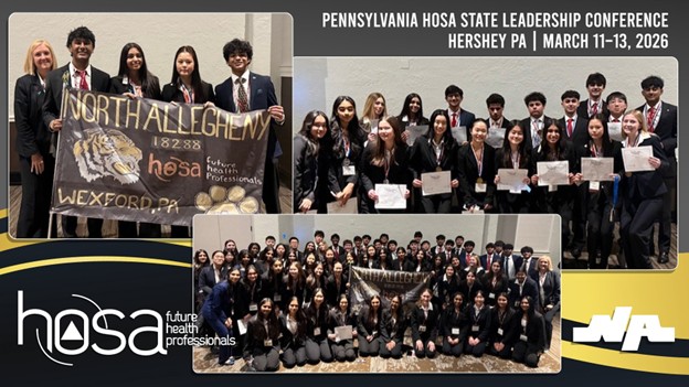 Seventy students from North Allegheny travelled to Hershey to take part in the annual PENN Health Occupations Students of America Conference. Among the awards at this event included a first-place victory in the Public Service Announcement category by Ella Huang, Muriel Liu, and Lynsey Zhao.