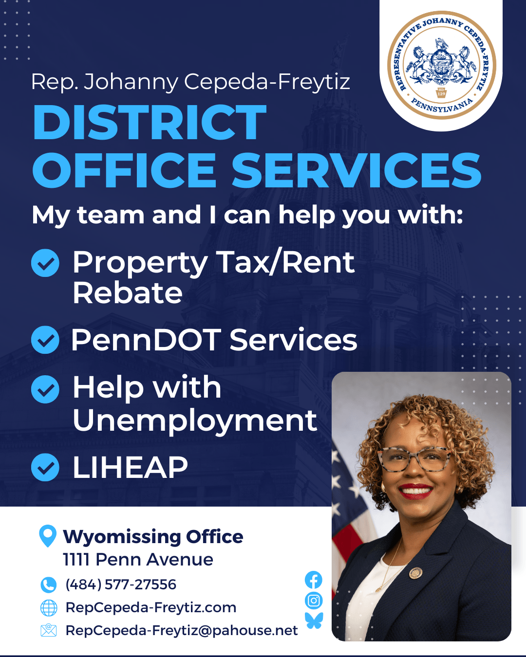 As always, my team and I are here to help you navigate state programs and services. Please reach out with any questions, concerns, or ideas. If you can't make it into my district office, you can visit one of my satellite offices! Find my office information below: