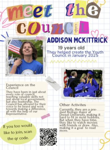 This week, I am spotlighting Addison McKittrick, a founding member of my Youth Council. They are currently a pre-med Biology student at Drexel University who has picked up significant experience in local government and leadership during their time on the council.