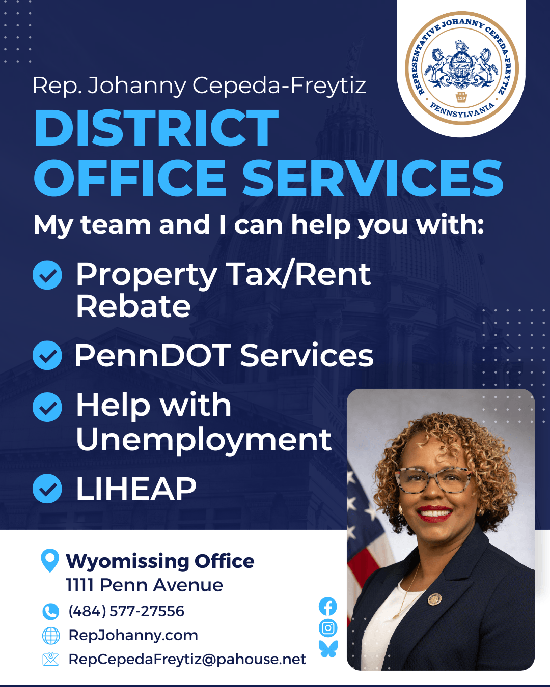 The Property Tax/Rent Rebate Program is accepting applications for rebates on taxes paid in 2025! My staff will be at the Spring Township Municipal Building (2850 Windmill Road, Sinking Spring) every second and fourth Friday of the month ahead of the June 30 application deadline to help you apply. The next event will be on May 8.