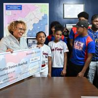 Rep. Cepeda-Freytiz gave a check to Latin Fusion Baseball to celebrate the organization receiving $60,000 in grant funding with her support.