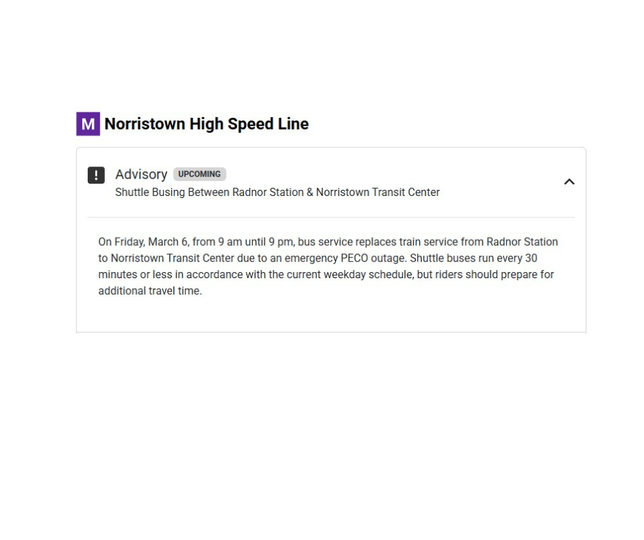 Today, Friday, March 6, from 9 AM until 9 PM, shuttle bus service replaces (M) train service from Radnor Station to Norristown Transit Center due to an emergency PECO outage. Shuttle buses run every 30 minutes or less in accordance with the current weekday schedule, but riders should prepare for additional travel time.