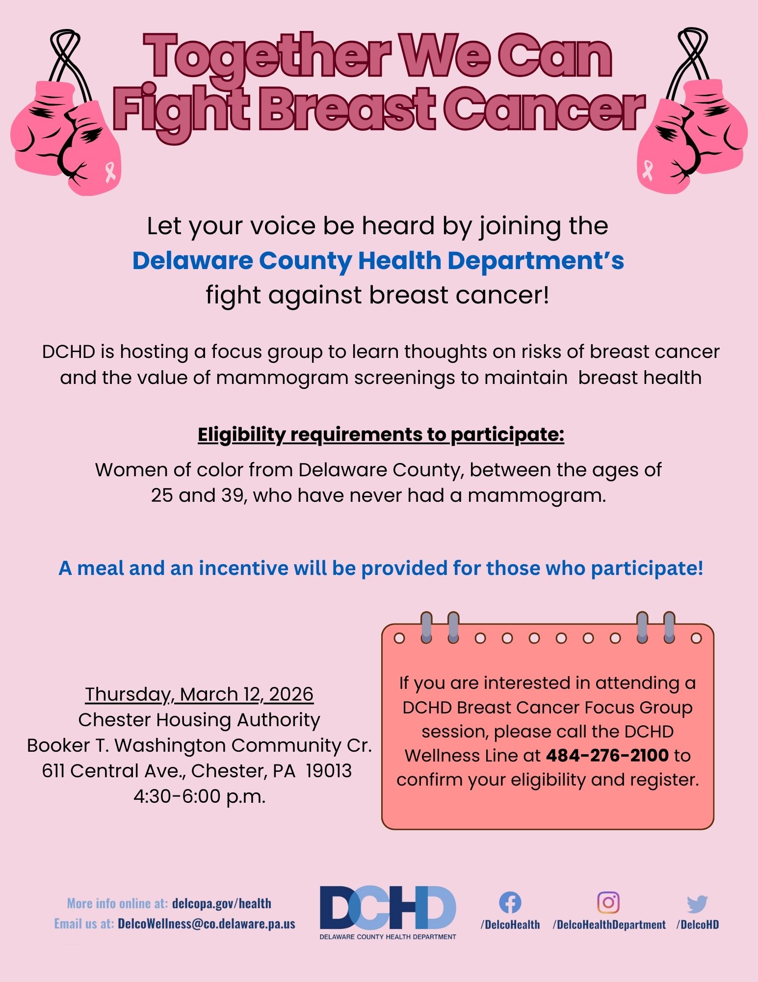 The Delaware County Health Department is hosting several focus groups this coming week to speak with women of color about barriers they’ve faced in getting screened for breast cancer. The goal is for the department to learn more about obstacles in breast cancer care so they can make an informed effort to remove them.