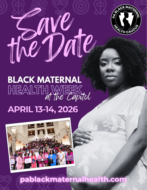 It’s almost that time of year again! Black Maternal Health Week at the Capitol is scheduled for April 13-14, 2026. Go to pablackmaternalhealth.com to learn about the PA Black Maternal Health Caucus’s work and to register for the week’s events.