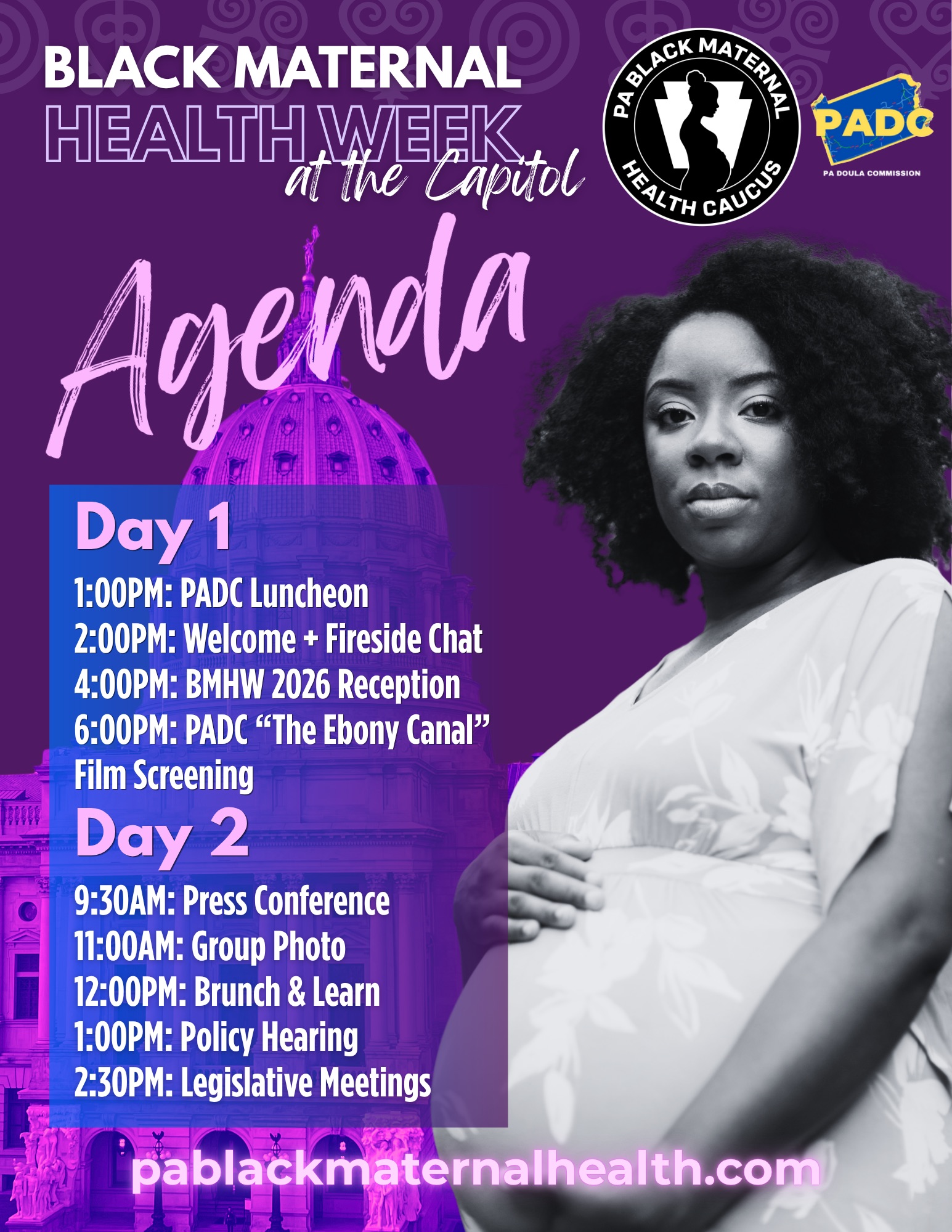 The PA Black Maternal Health Caucus is celebrating on Monday and Tuesday when we head to Harrisburg for voting session. Our Capitol events include a rally in the Capitol’s historic main rotunda, a fireside chat, a screening of the documentary The Ebony Canal, and a lot more – keep reading for details on everything you can attend to learn about and support our mission!