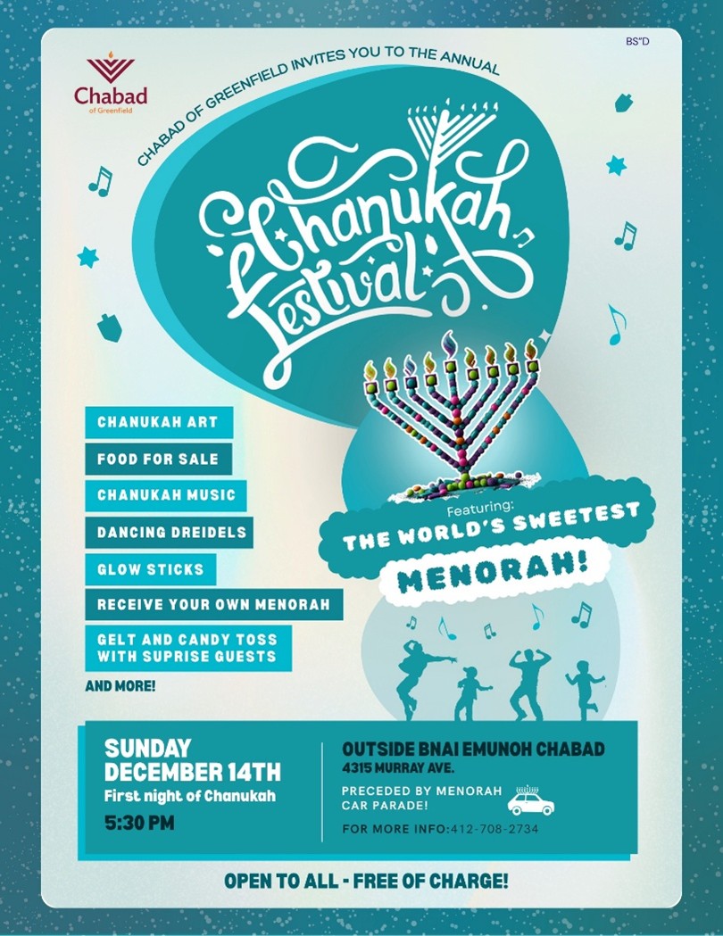 Chabad of Greenfield will host a community Chanukah celebration featuring arts and crafts, dancing dreidels, glow sticks for children, a gelt and candy toss, and complimentary menorahs for attendees to take home. Each child will receive a small gift, and the Allderdice Marching Band will perform live to celebrate the first night of Chanukah. This event is open to the public.