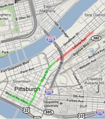 Pittsburgh’s annual St. Patrick’s Day Parade begins at Liberty Avenue and 11th Street, continuing to Grant Street and the Boulevard of the Allies, where it turns right. The parade proceeds along the Boulevard of the Allies to the reviewing stand at Stanwix Street before dispersing at Commonwealth Place.