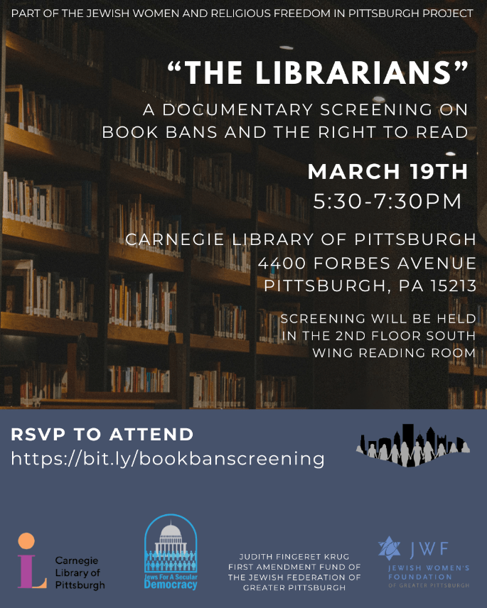 Jews for Secular Democracy will host a screening of “The Librarians,” a documentary exploring efforts to remove books from schools and libraries and the librarians responding to those challenges. Introductory remarks will connect the film’s themes to national and local developments. Doors open at 5:30 p.m.; screening begins at 6:00 p.m.