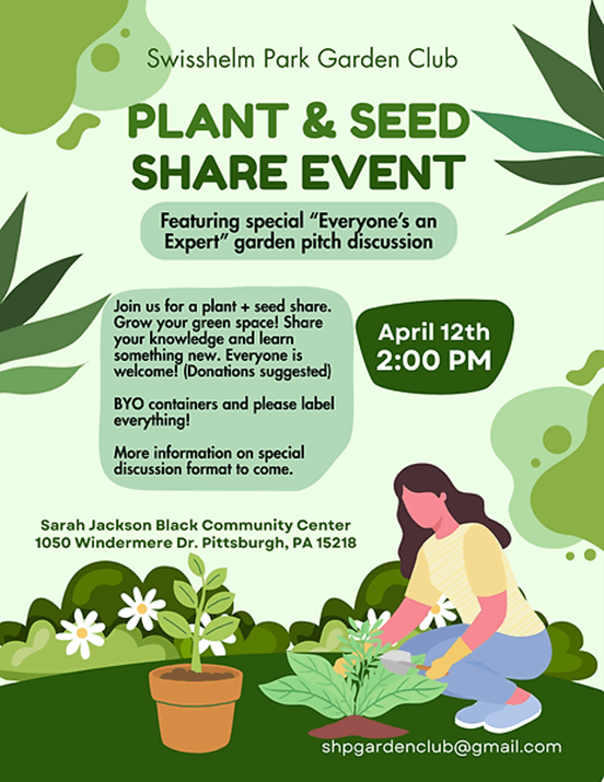 Join neighbors for the Swisshelm Park Garden Club’s Plant, Seed, and Knowledge Share. This community gathering invites participants to exchange plants and seeds while learning from one another through the club’s “Everyone’s an Expert” discussion. It’s a welcoming way to connect with fellow gardeners, pick up new ideas, and get ready for the spring season.