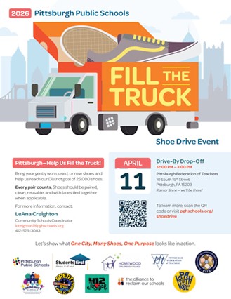 Support the Pittsburgh Public Schools Shoe Drive by donating new or gently used shoes at this easy, drive-by event benefiting Community Schools initiatives.