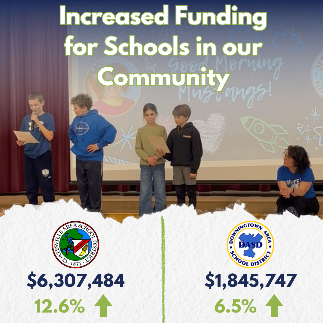 For the second year in a row, this budget takes a significant step toward meeting our constitutional obligation to ensure every student, regardless of zip code, has the resources they need to succeed. It fully funds the second installment of adequacy and tax equity payments, a $565 million increase statewide. Locally, that means significant funding increases for the Coatesville Area School District, which will see a net increase of $6.3 million, or 12.6% over 2024-2025, and the Downingtown Area School District, which receives a net increase of $1.8 million or 6.5%.