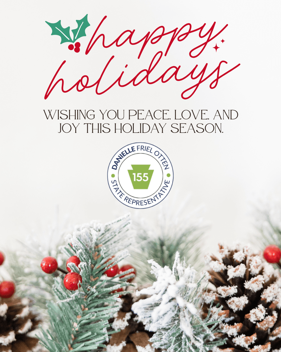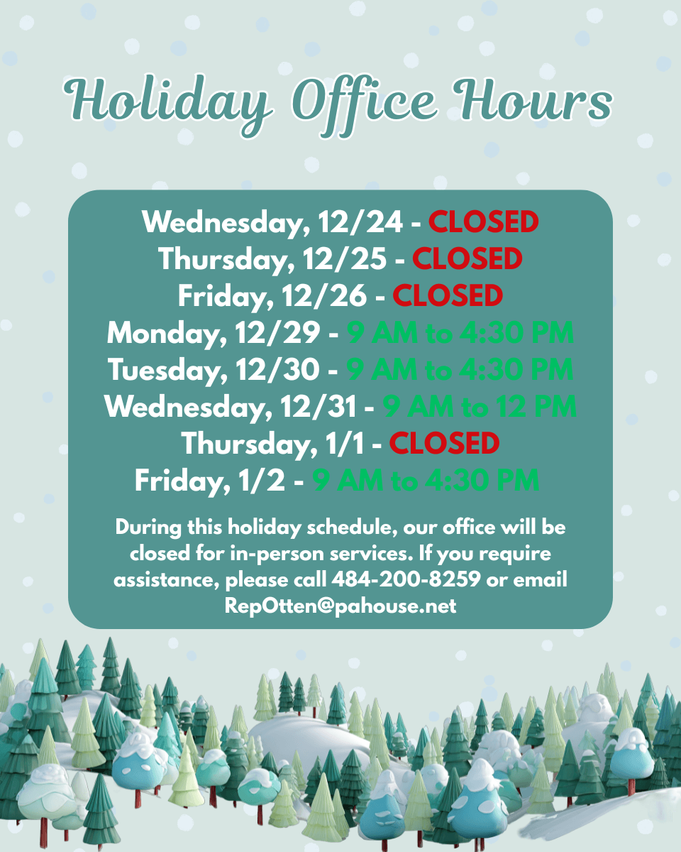 My office will be open for normal business hours on Monday, December 22 and Tuesday, December 23 and closed for the remainder of the week. The following week, we will offer constituent services by email and phone but will be closed for walk-in visits. We will return to in-person on January 5 to assist with SEPTA passes, PennDOT forms, unclaimed property, and other state-related services. We will continue to monitor email and voicemail throughout the holidays, so if you require assistance, please call 484-200-8259 or email RepOtten@pahouse.net.