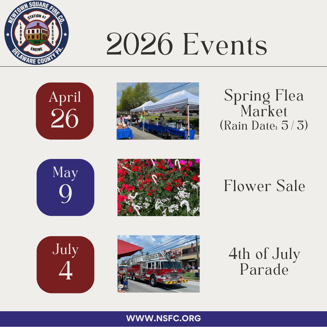 - Newtown Square Fire Co. upcoming events (4/26, 5/9, 7/4)