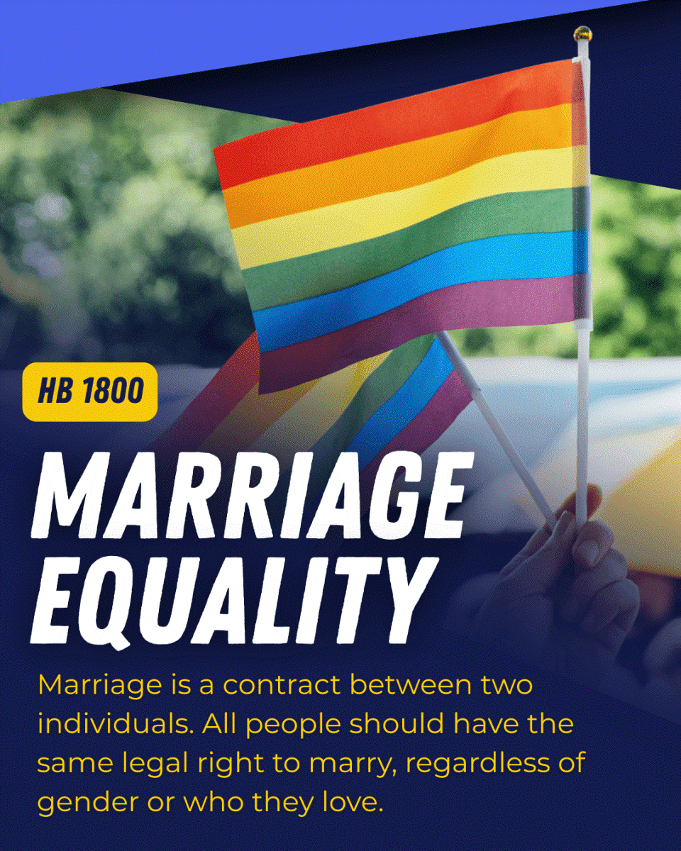 HB 1800 – This bill updates Pennsylvania law to protect marriage equality by redefining marriage as a civil contract between two people, ensuring that our laws reflect fairness, dignity, and equal protection for all.