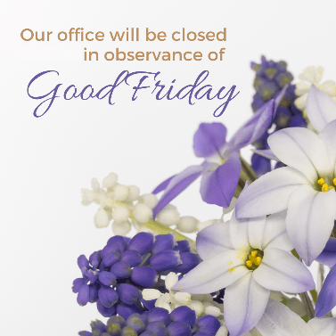 My office will be closed on Friday, April 3 in observance of Good Friday.