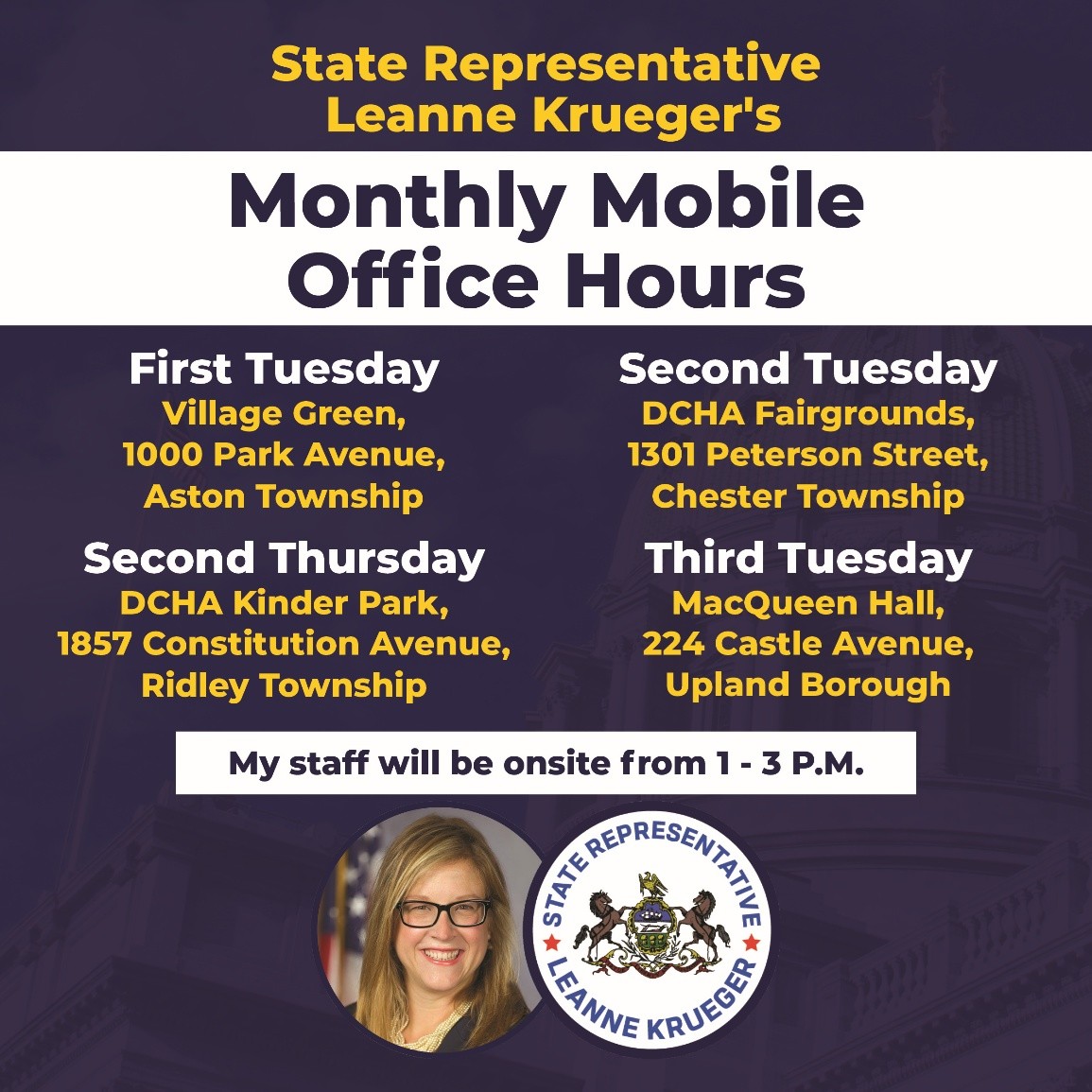 If you need assistance, leave a message at 610-534-6880 or email RepKrueger@pahouse.net. Calls and emails will be responded to when we reopen on Monday, April 6.