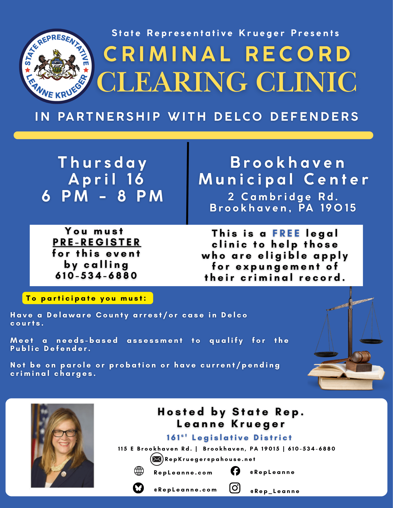 Registration is required. Call my office at 610-534-6880 or email RepKrueger@pahouse.net to register.